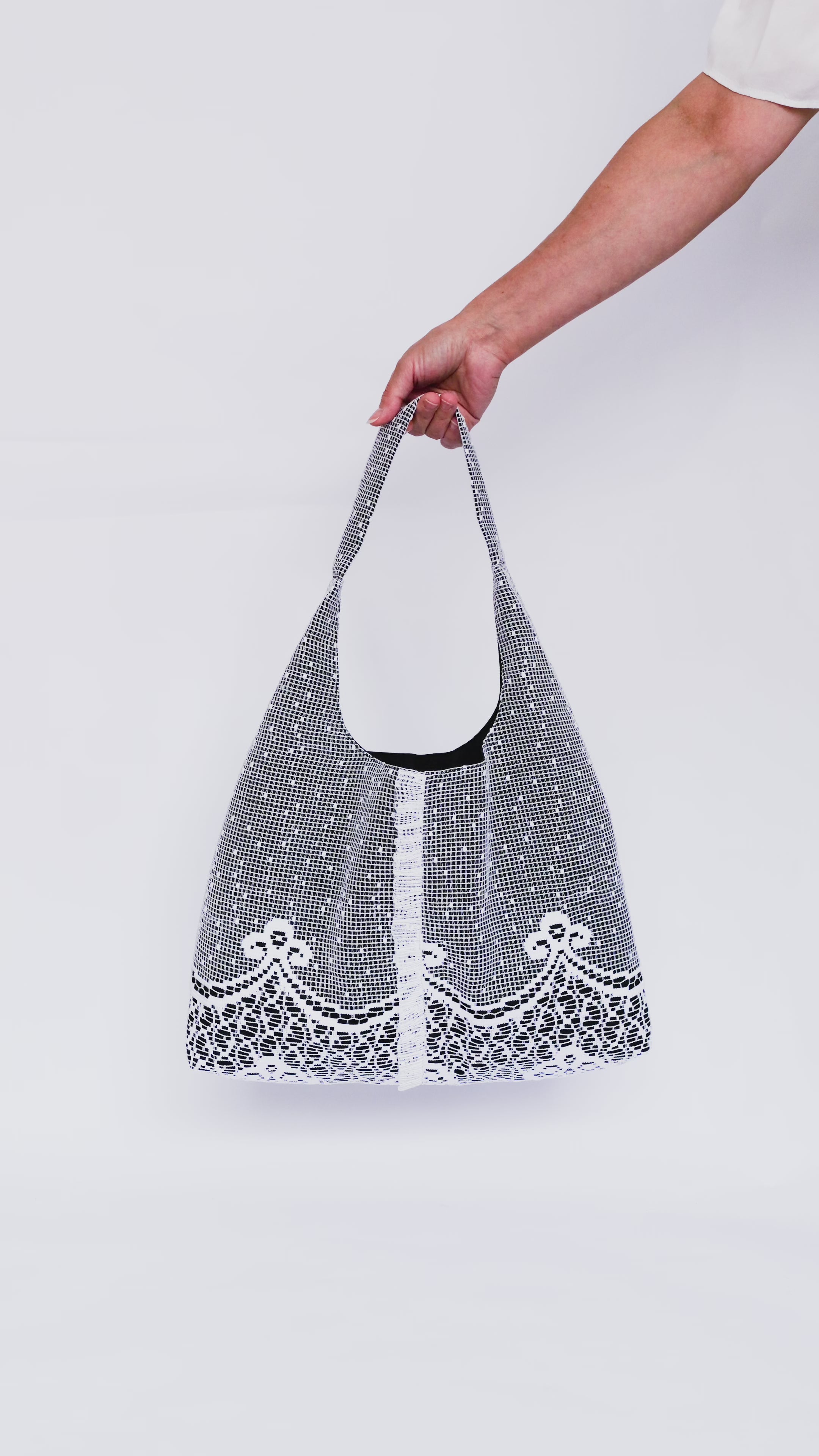 Léger et élégant, ce sac à épaule allie simplicité et délicatesse. Confectionné à la main, il se distingue par son froufrou central en tissu contrasté, qui apporte une touche romantique et ludique.